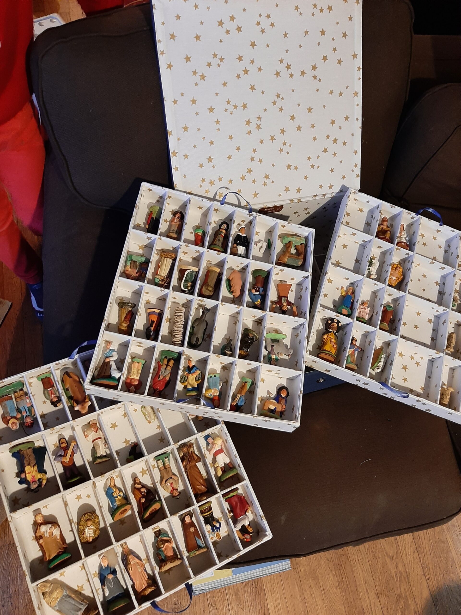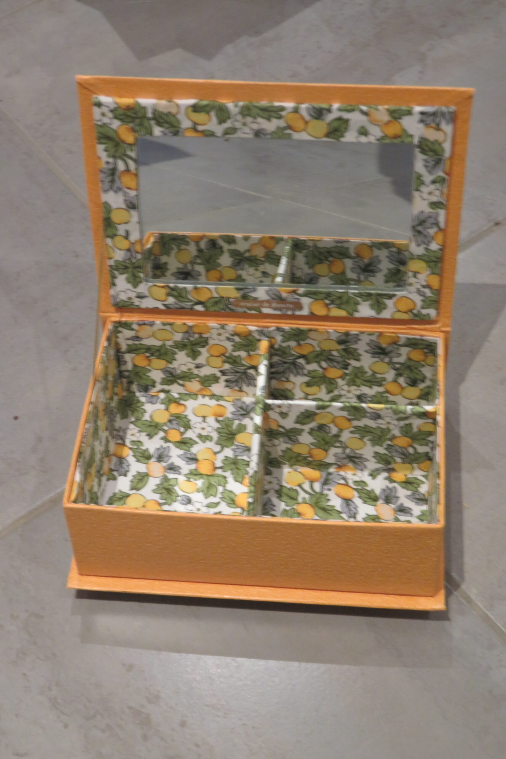 Je réalise pour vous différents objets : coffret à bijoux, boite à couverts, boites à chapeaux, boites de couture, boites à montres, boites à cartes ou a lunettes et de nombreuses autres boites. Mon produit « phare » : la boite de rangement pour vos santons !